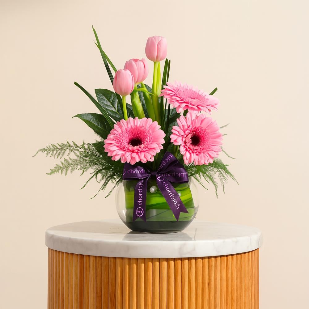تم تنسيق الزهور والنباتات الخضراء بتناغم ناعم داخل مزهرية زجاجية أنيقة. ينعكس جمال التوليب والجربارة الوردي وسط الأوراق الخضراء ليمنح التنسيق طابعاً عصرياً مليئاً بالحيوية والرقة، ليكون هدية تلامس القلوب في لحظات الامتنان أو لمسة جمالية في أي مساحة.