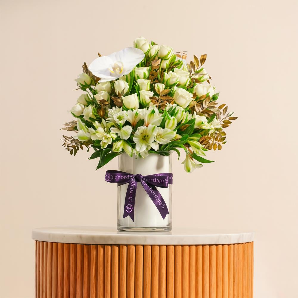 تم تنسيق الزهور بعناية داخل فازة زجاجية شفافة، ومغلفة بورق أبيض يمنحها طابعاً عصرياً هادئاً. تدرجات الأبيض مع لمسة من الذهبي تضفي على التنسيق شعوراً بالراحة والنقاء، ليكون خياراً أنيقاً لإيصال مشاعر صادقة بلغة الزهور.