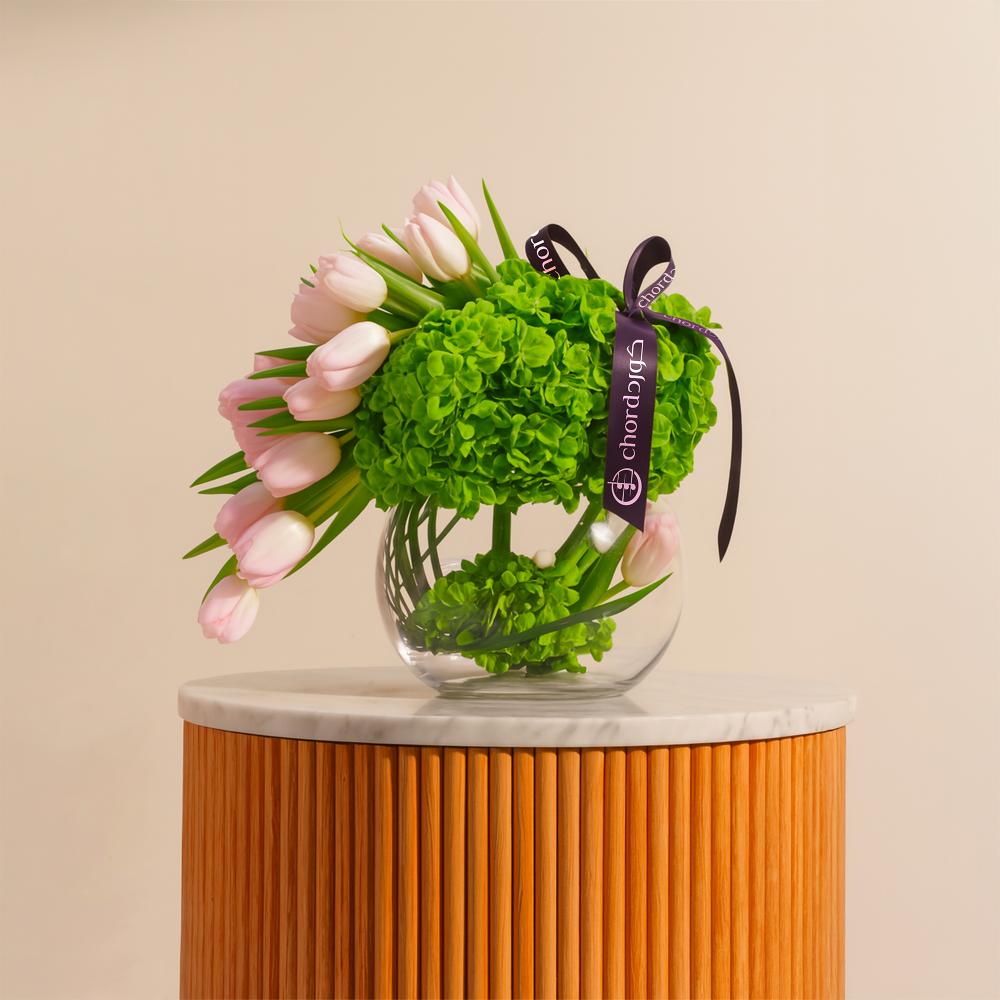 أضف لمسة من الجمال والرقي إلى يومك مع تنسيق زهور ناعم ينبض بالهدوء والأناقة. مزيج متناغم من التوليب الوردي والهيدرانجيا الخضراء يخلق إحساسًا بالصفاء ويعبّر عن ذوق راقٍ في أبسط التفاصيل.